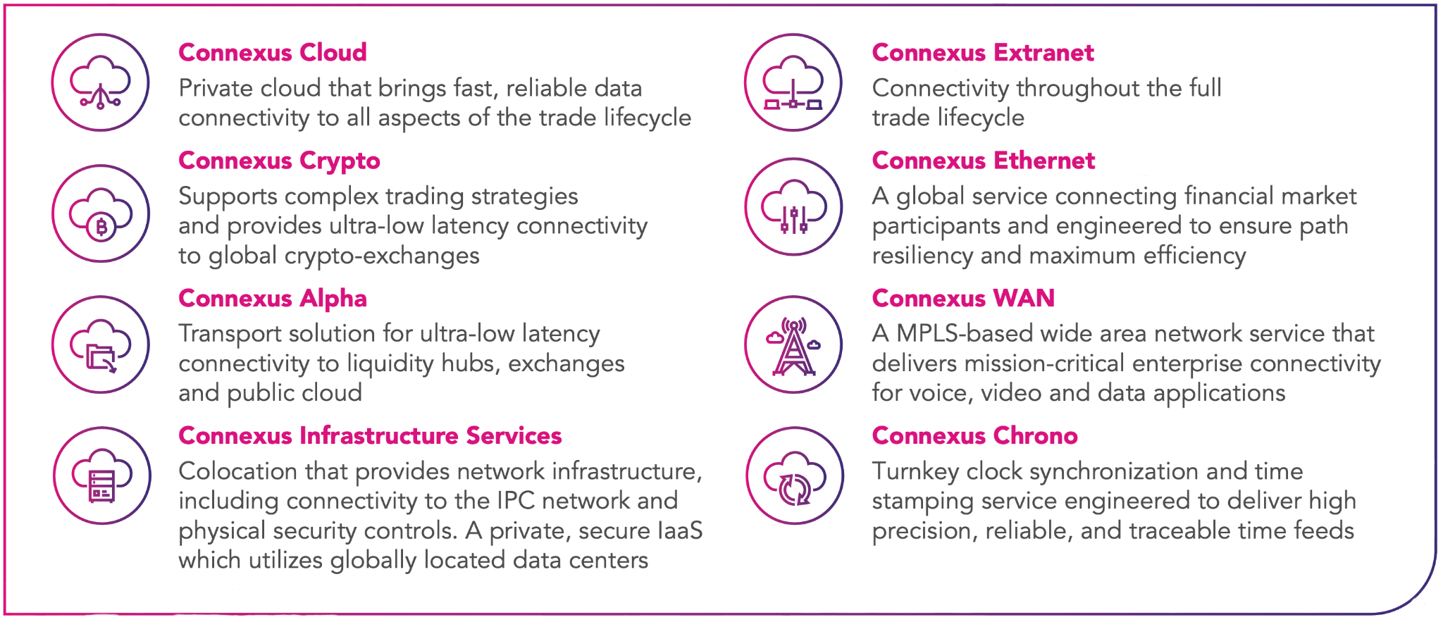 IPC’s Connexus®-plattform är centrum för global finansiell kommunikation. Den är utvecklad för att möta de extremt höga kraven på kapitalmarknaderna och levererar säker, högpresterande anslutning som är utformad för tradingföretag, likviditetsleverantörer, applikationsleverantörer, marknadsdataleverantörer och fler.